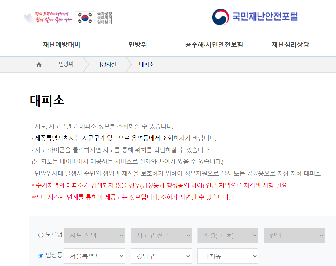 대피소의 위치를 알고자 한다면 지도 앱이나 포털에서 '대피소'를 검색해 보세요. 네이버 검색/지도, 카카오맵 검색, 티맵 등을 통해 민방위 대피소의 위치를 확인할 수 있습니다. 기존의 국가재난안전포털과 안전디딤돌 앱에서 이용 가능합니다.