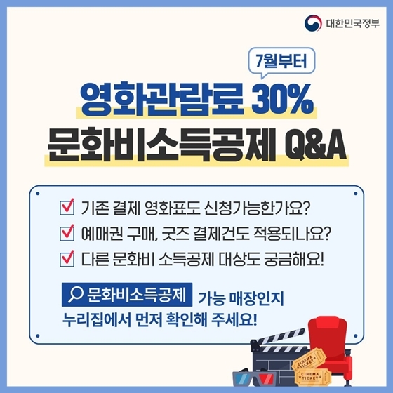 10. 7월부터 문화비소득공제 영화 티켓에 대해 30%의 공제가 가능합니다.