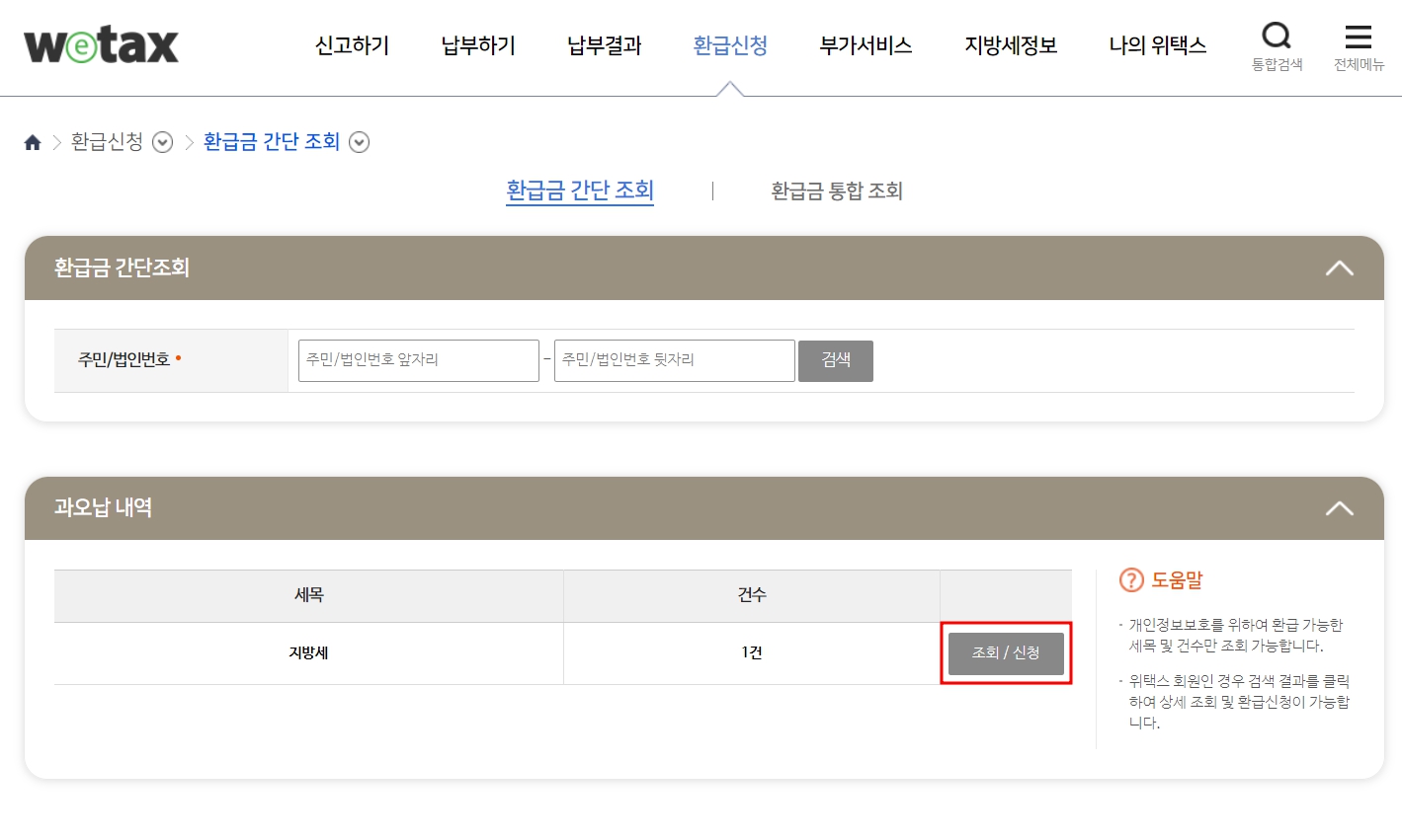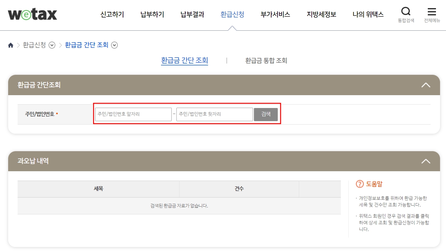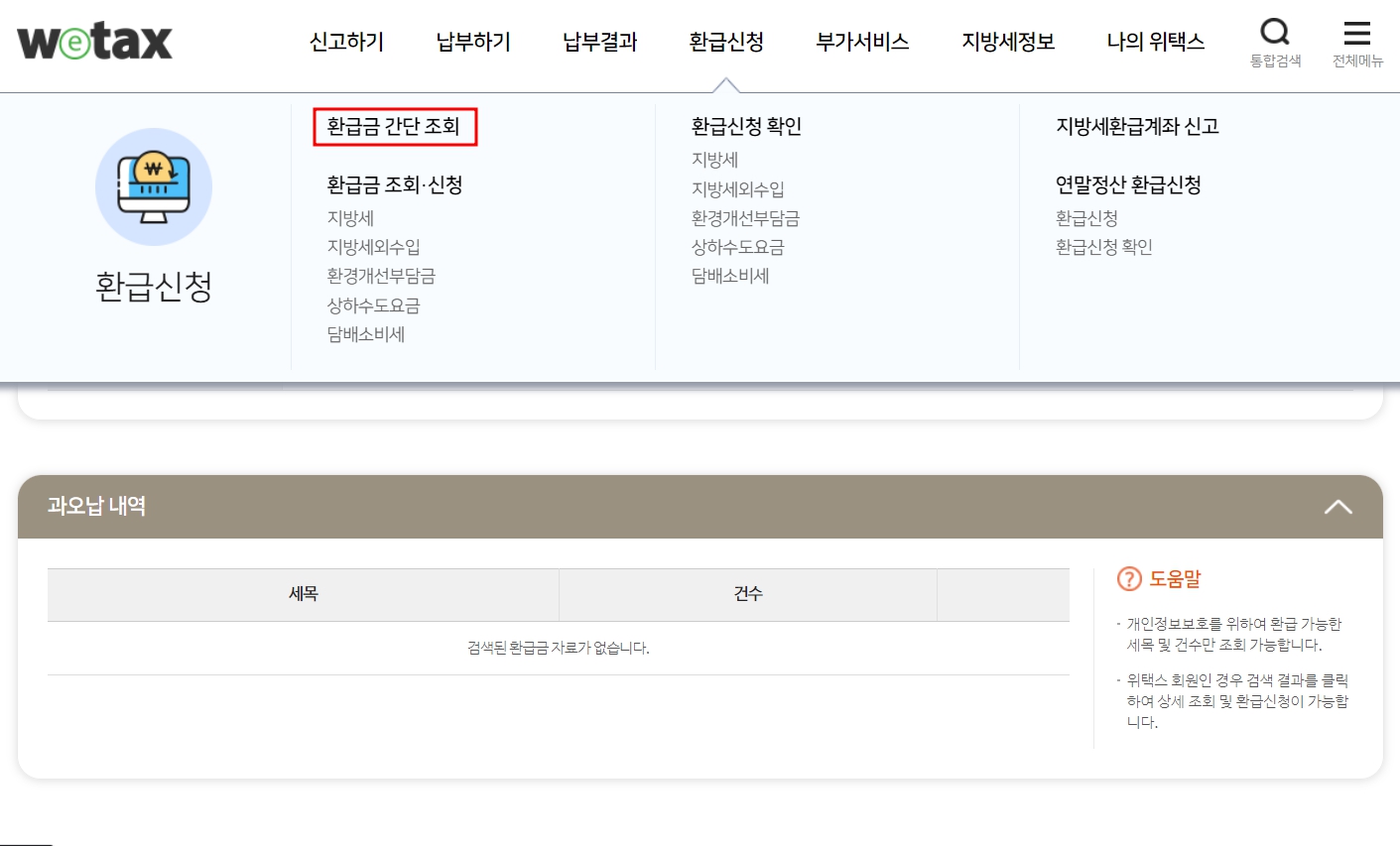 위택스 환급금 간단조회 및 통합조회 바로가기(7)