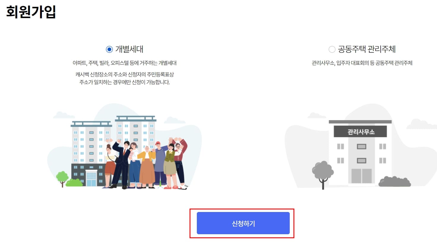 4. 회원가입 페이지에서 아파트, 주택, 빌라, 오피스텔 등에 거주하는 개별세대를 체크한 뒤 신청하기 버튼을 눌러줍니다. 다만 공동주택 관리주체로 관리사무소, 입주자 대표회의 등에 해당되면 공동주택 관리주체를 체크해 줍니다.