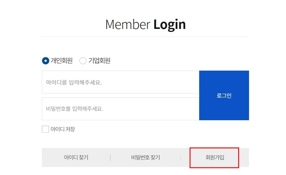 3. 로그인 화면에서 개인회원 체크 후 회원가입 버튼을 눌러줍니다.