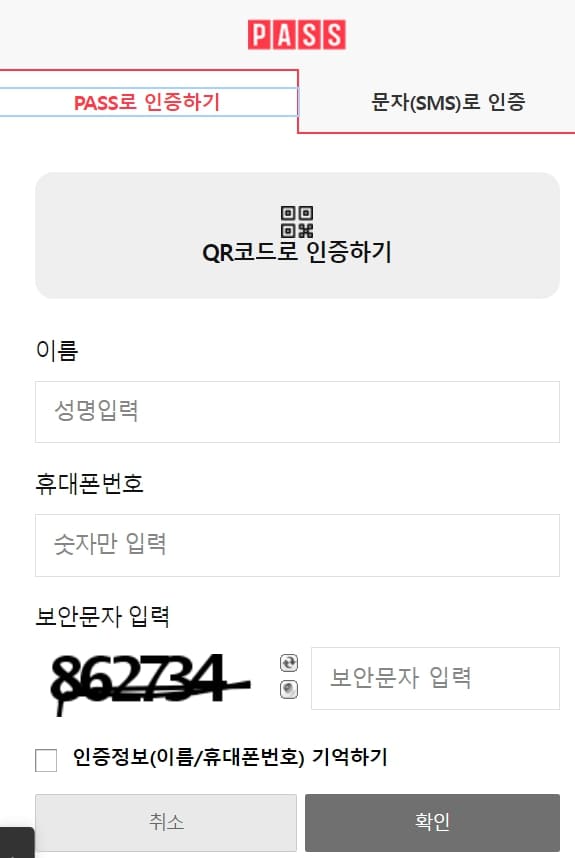 7. PASS 인증이나 문자로 인증을 통신사 선택 전화번호 입력한 뒤 인증을 선택합니다.