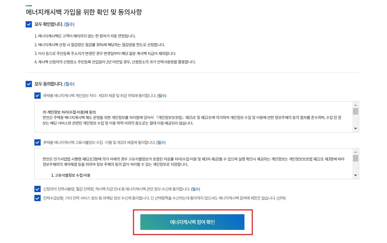 13. 에너지캐시백 가입을 위한 확인 및 동의사항에 필수항목을 체크한 뒤 또는 모두 확인을 체크해 준 다음 에너지캐시백 참여확인을 클릭해 줍니다.