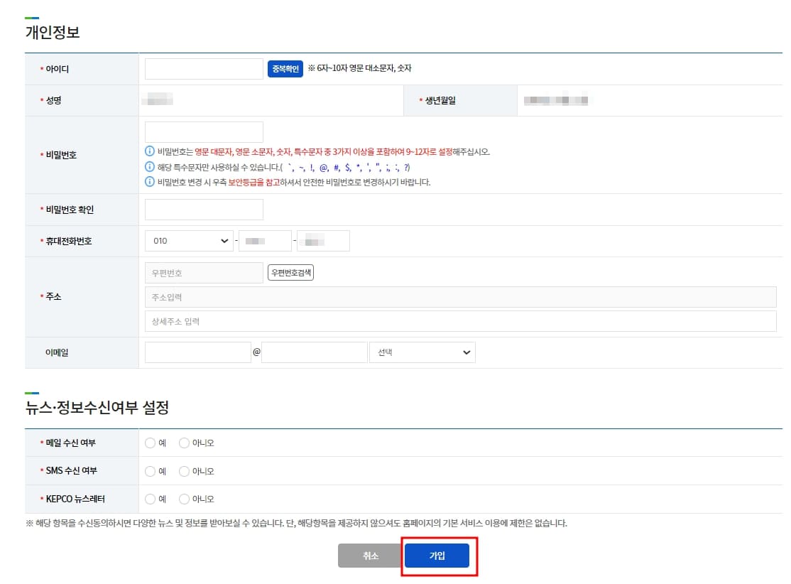 11. 개인정보 입력란에 아이디, 성명, 비밀번호, 주소, 이메일을 입력하고 뉴스/정보수신여부 설정에 동의하고 가입을 선택합니다.