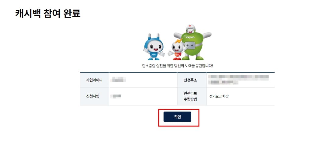 14. 캐시백 참여 완료 화면이 나오면 가입아이디, 신청주소, 신청자명을 체크해 준 다음 확인을 눌러줍니다. 이제 완료되었습니다. 신청하느라 고생하셨습니다.