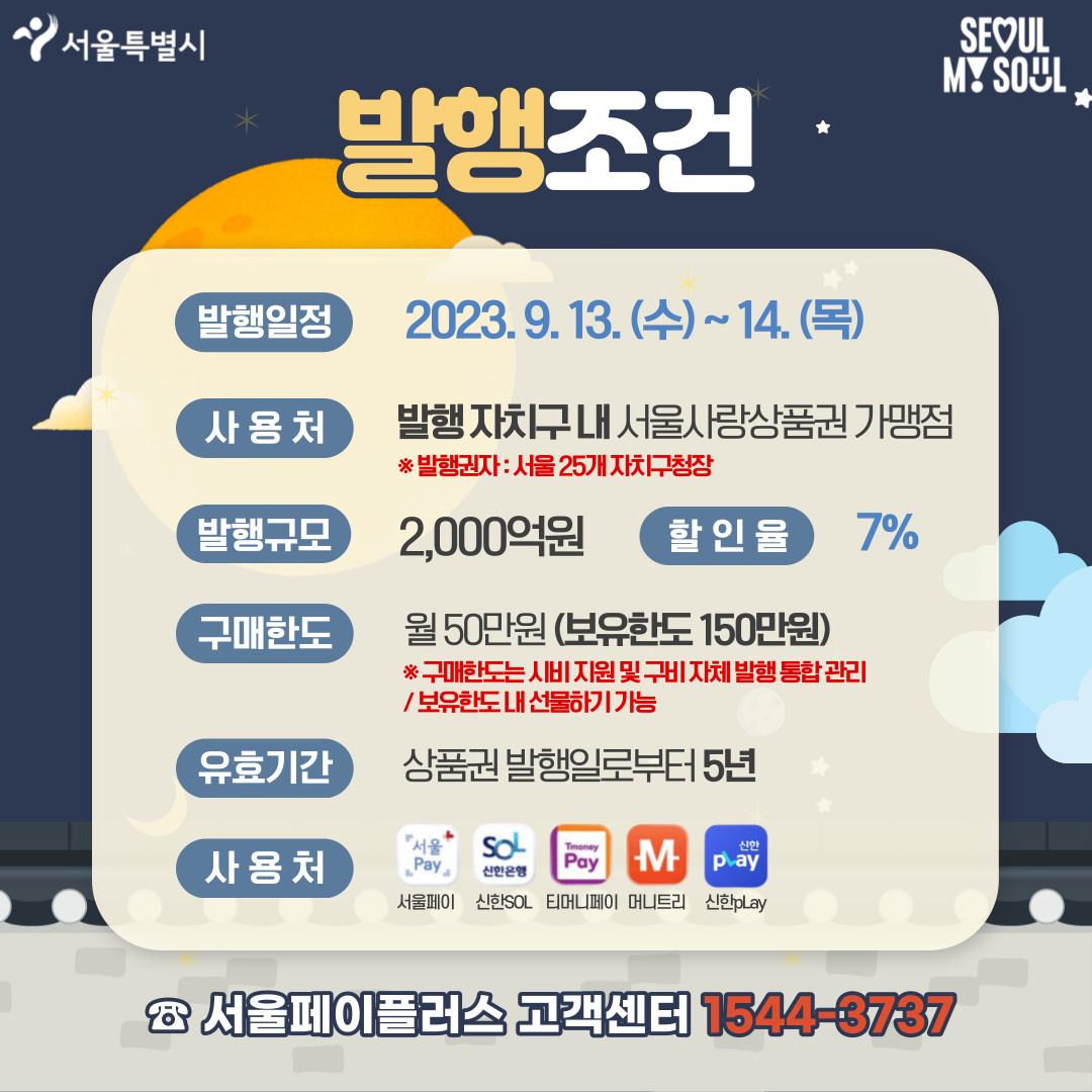 지속적인 고물가 상황에서 서울사랑상품권 발행을 통해 서민들의 추석 준비 부담을 덜어주고 지역상권에 활력을 불어넣어 주기 위해 추석을 앞두고 9월 13일 ~ 14일 이틀 동안 7% 할인된 금액으로 총 2,000억 원 규모의 지, 자치구 서울사랑상품권을 발행합니다.